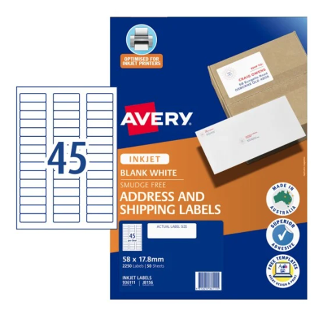 • Avery Quick Peel Address Label With Sure Feed J8156 45/sheet Inkjet Perm 58x17.8mm 50 Sheet