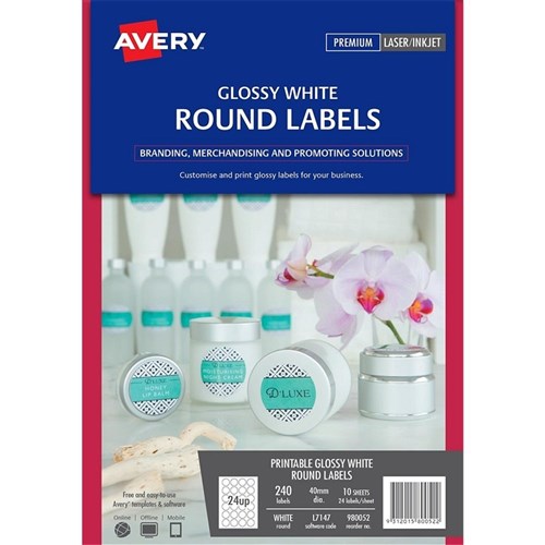 Avery Blank Printable Labels L7147 40mm Round Gloss White 24UP 240 Labels 10 Sheets