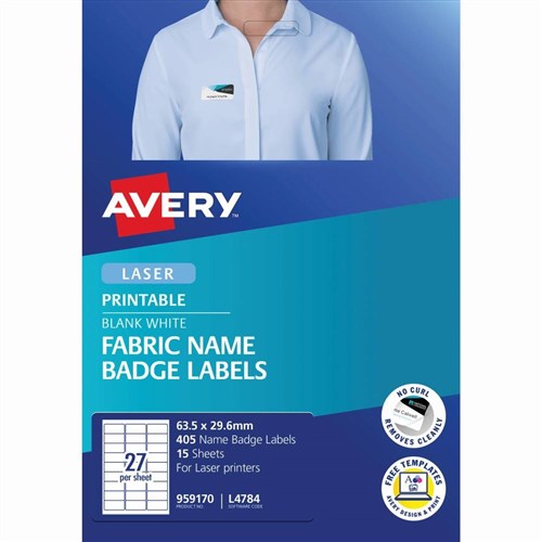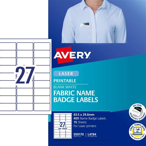 Avery Fabric Name Badge Laser Labels White L4784 63.5x29.6mm 27UP 405 Labels 15