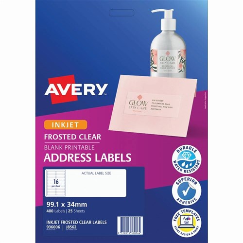 Avery Frosted Clear Inkjet Address Labels J8562 99.1x24mm 16UP 400 Labels