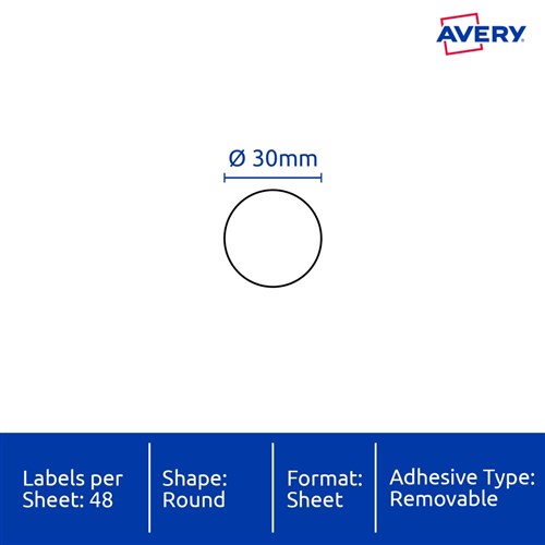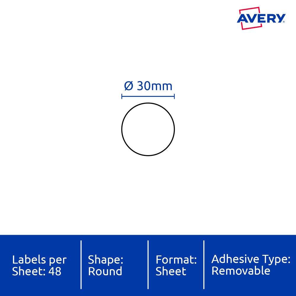 Size: 30mm diameter 960 labels, 20 sheets. 48 labels per sheet (48UP).
