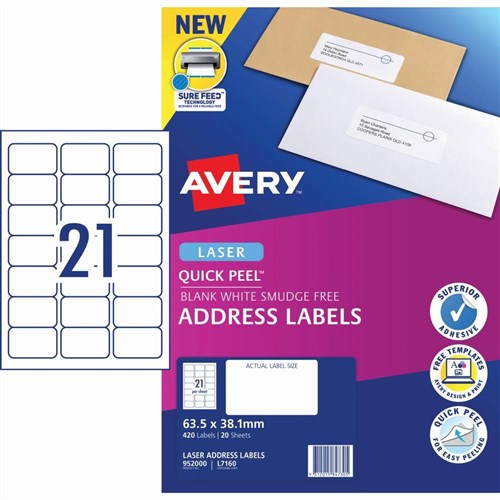 Avery Quick Peel Address Laser Labels White L7160 63.5x38.1mm 21UP 420 Labels 20 Sheets