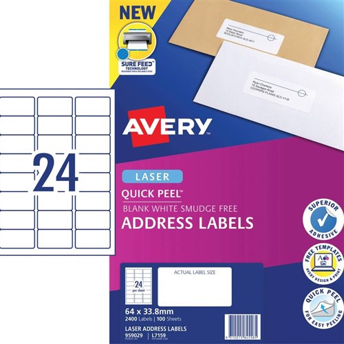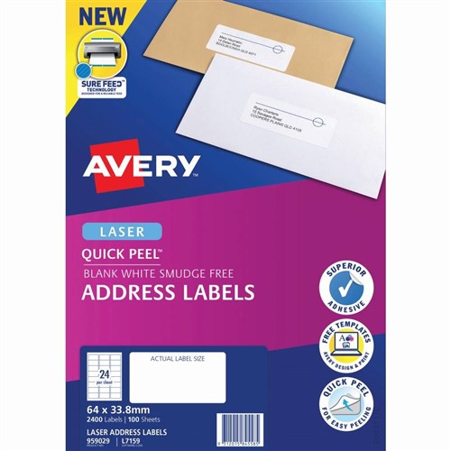 Avery Quick Peel Address Laser White L7159 64 x 33.8mm 24UP 2400 Labels 100 Sheets