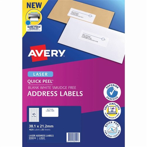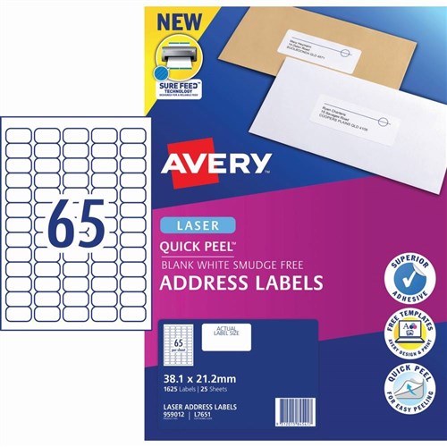 Avery Quick Peel Address Laser White L7651 38.1x21.2mm 65UP 1625 Labels 25 Sheet