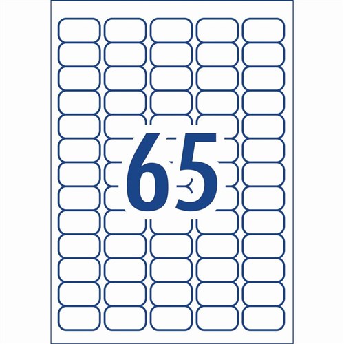 Size: 38.1x21.2mm 1625 labels, 25 sheets. 65 labels per sheet (65UP).