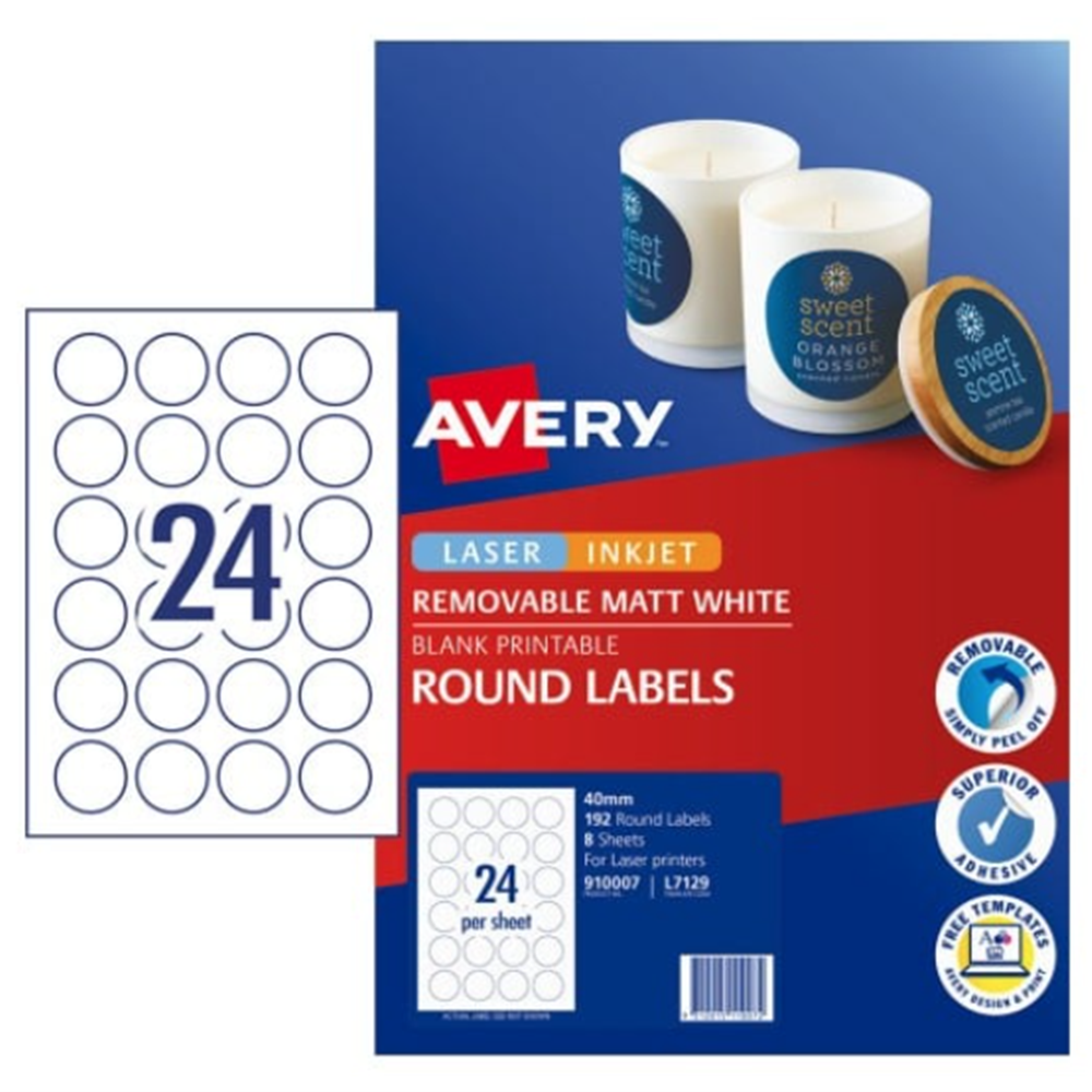 Avery Removable Labels L7129 40mm Round Matte White 24UP 192 Labels 8 Sheets