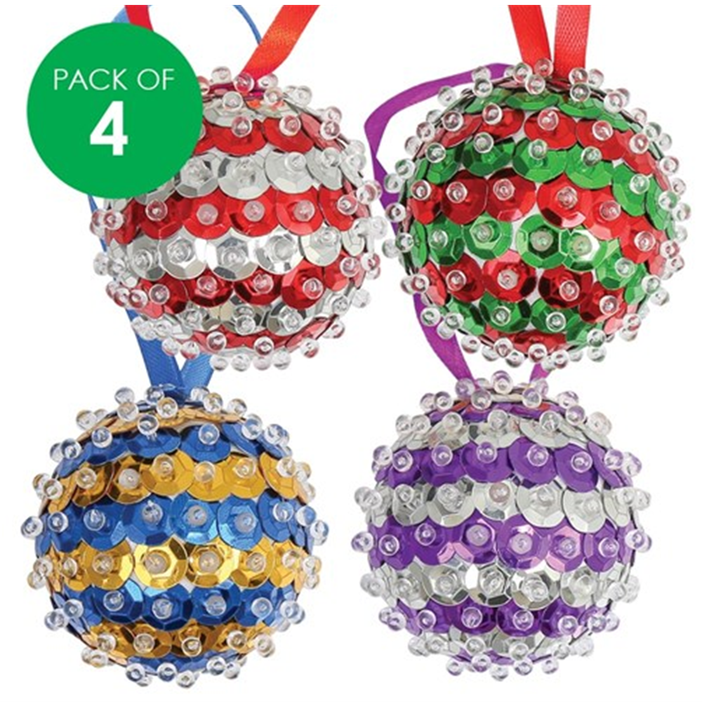 Pack includes all components required to create and decorate 4 Decofoam Sequin Baubles