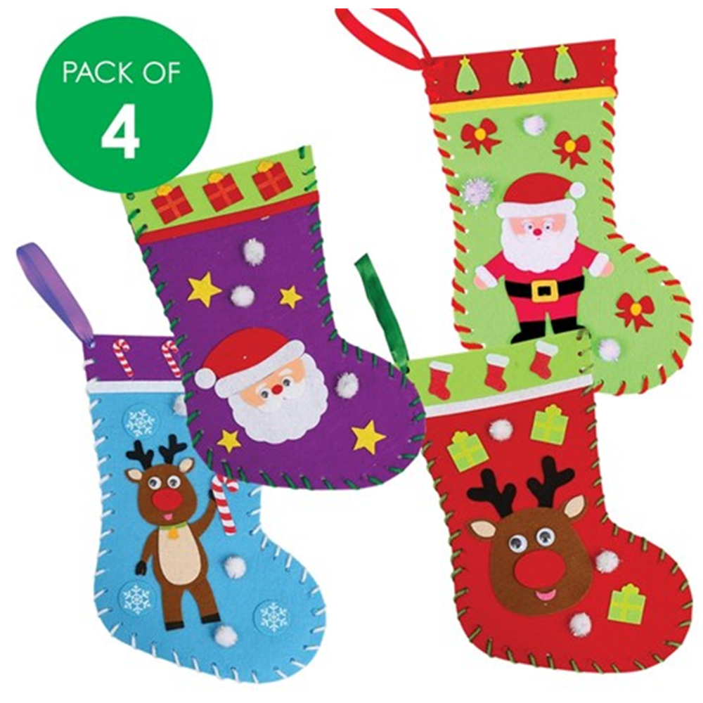 Pack includes all components required to make 4 Felt Stockings in 4 different designs.
