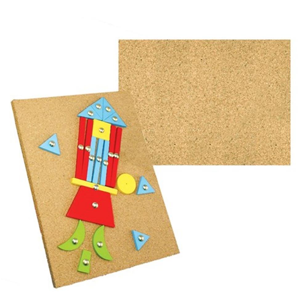 Build your own artwork using this corkboard with wooden shapes, a hammer and tacks (sold separately).