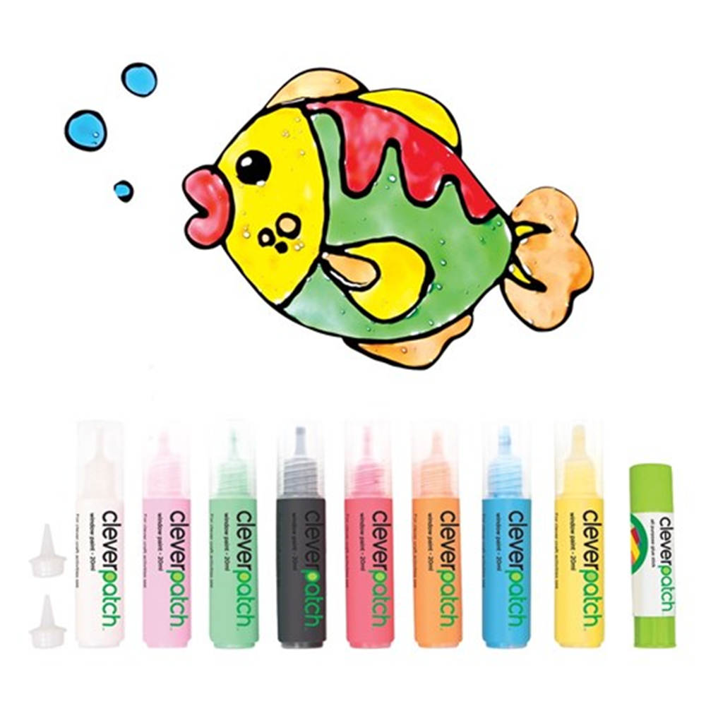 Includes 8 window paints in assorted colours, 2 plastic painting sheets, glue stick, 2 replacement tops