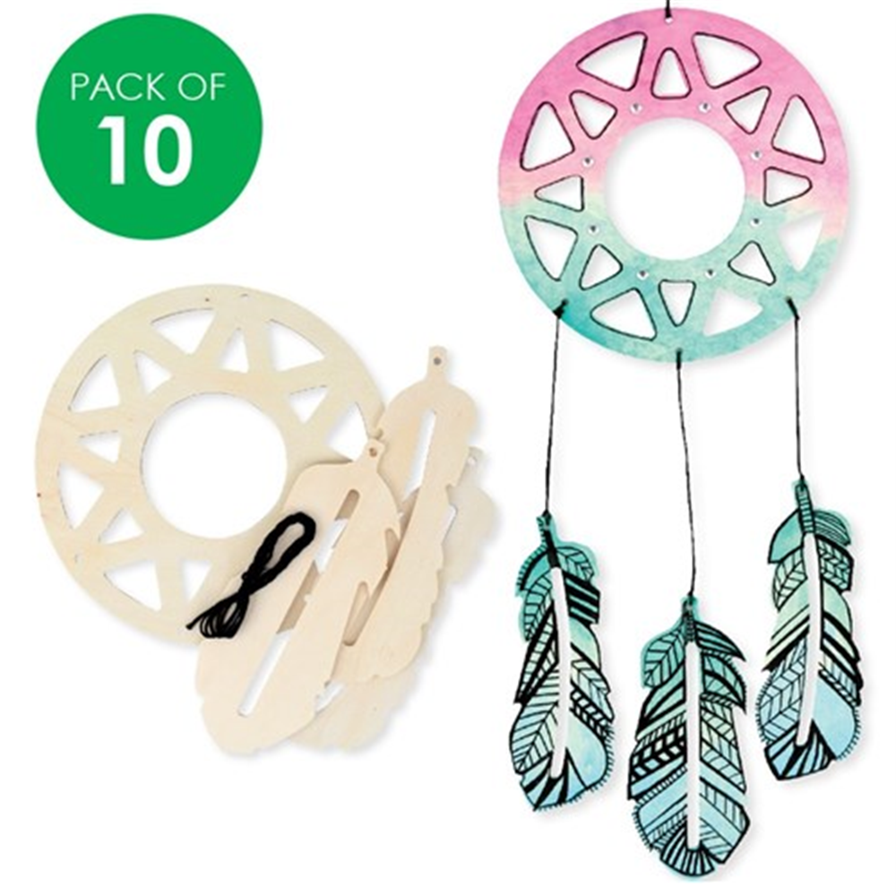 Pack includes wooden pieces and black embroidery thread to create 10 Dream Catchers.