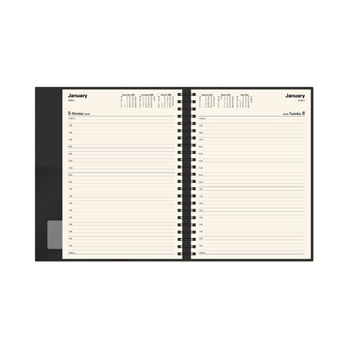 Pen loop, lay flat opening, ribbon marker, day to page layout.
