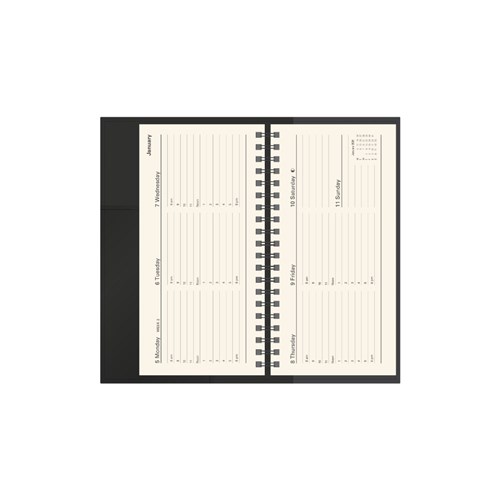 Pen loop, lay flat opening, ribbon marker and week to view layout.