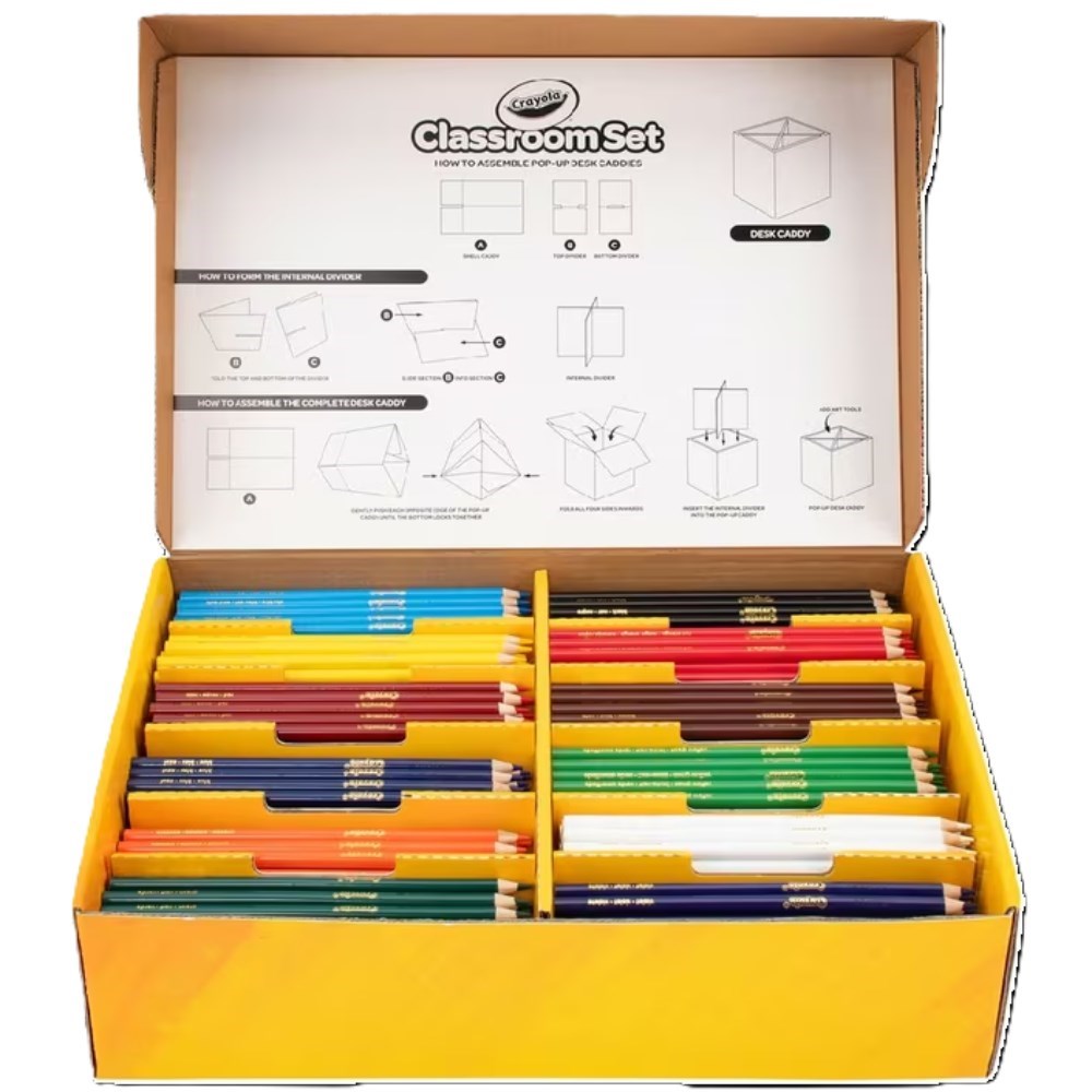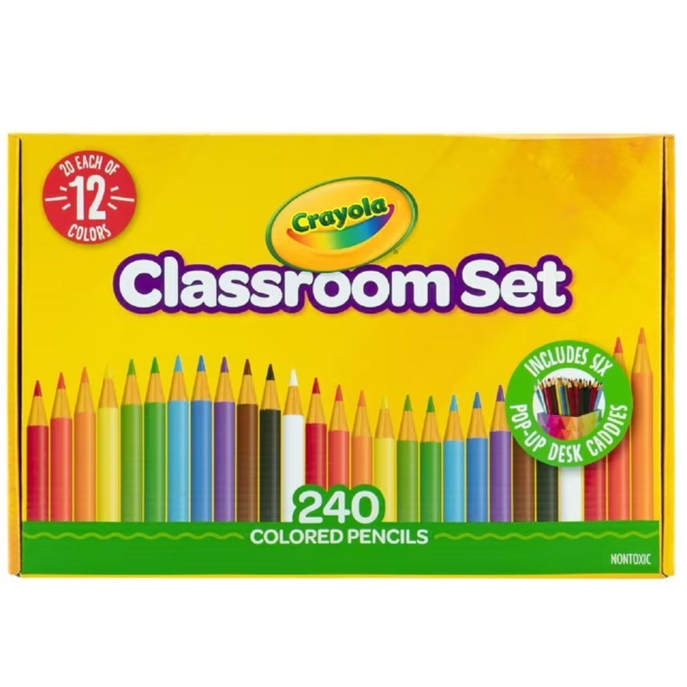 • 240 coloured pencils that come in a box that folds out into desk caddies, so you divide these fun coloured pencils throughout the whole class.
