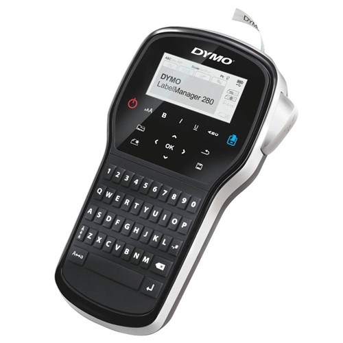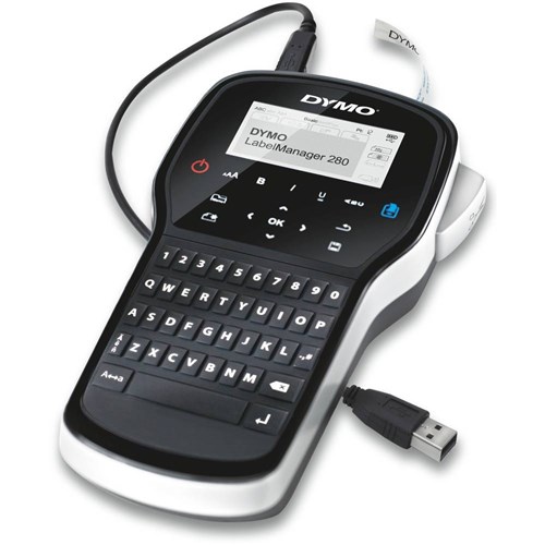 Includes LabelManager™ 280 Label Maker, rechargeable battery pack, USB cable and D1 starter label cassette, black on white 12mm x 3m.