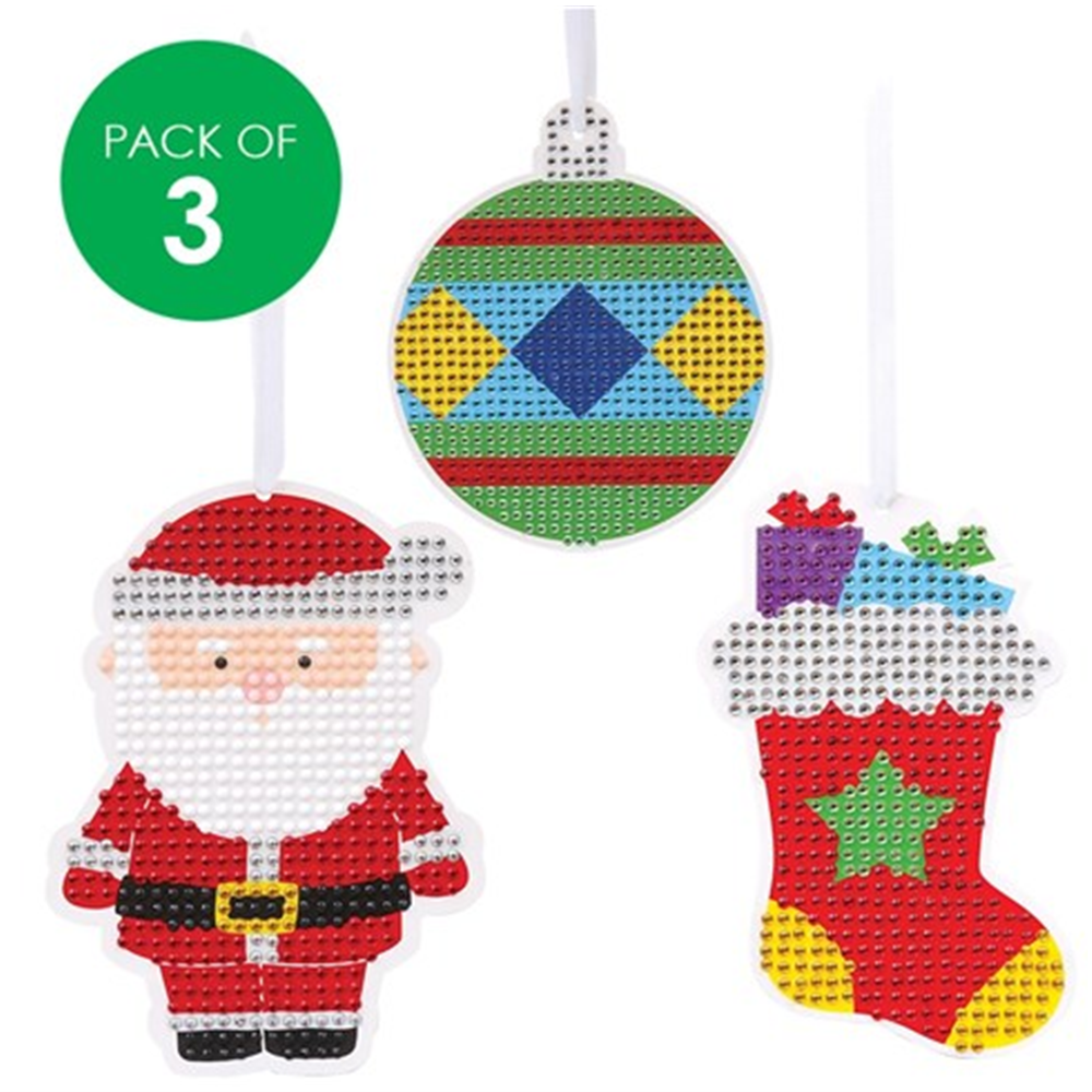 Pack includes all components required to create and decorate 3 Christmas Gem Art Ornaments