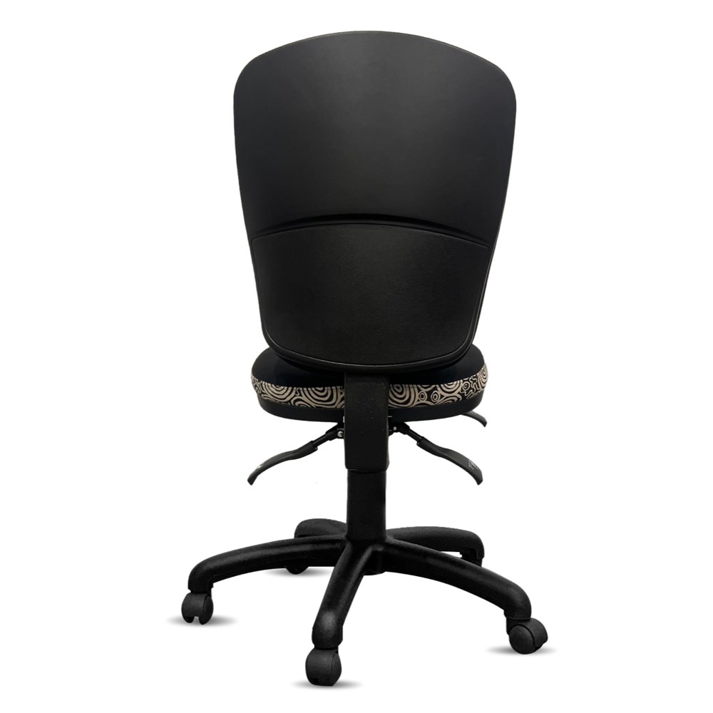 Heavy duty commercial chair with 3 lever mechanism and ratchet back height adjustment.