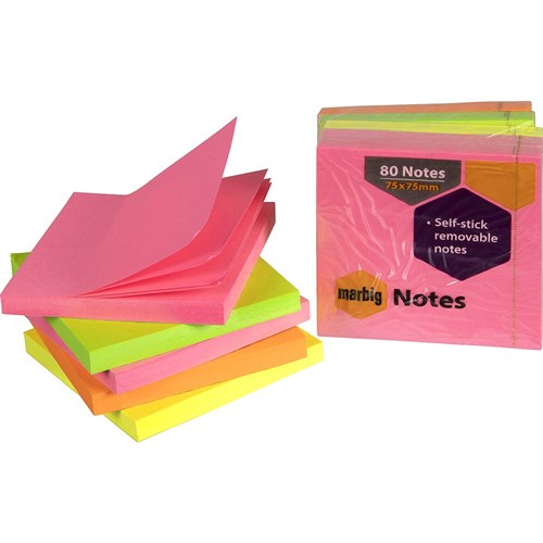 Marbig Repositionable Notes 75 x 75mm Brilliant Neon 80 Sheet Pad Assorted Pack 5