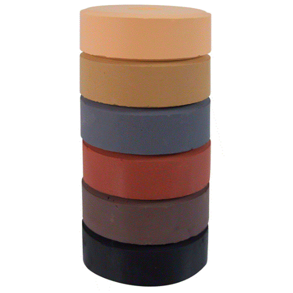 Earth colours including yellow ochre, burnt sienna, burnt umber, grey, black and peach.