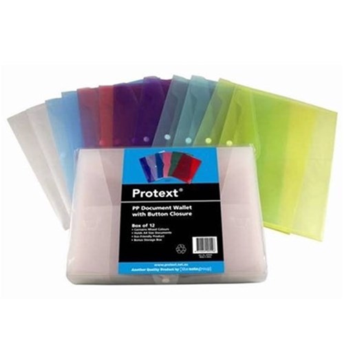 Protext Poly Document Wallets A4 Button Assorted Colours Pack of 12 in Filing Box