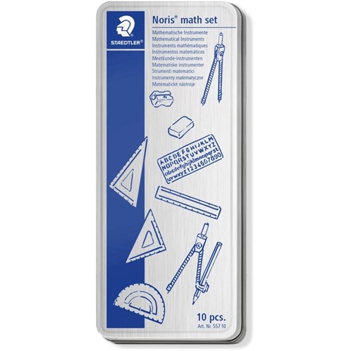 Contains ruler, protractor, set squares, sharpener, eraser, pencil, compass, dividers and lettering guide.