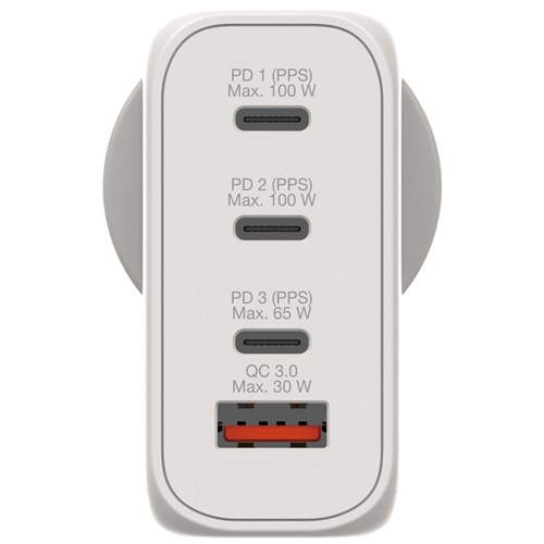 Consolidates multiple chargers into one, combining two USB-C PD 100W ports, one USB-C PD 65W port and one USB-A QC 3.0 port in a sleek palm sized design.