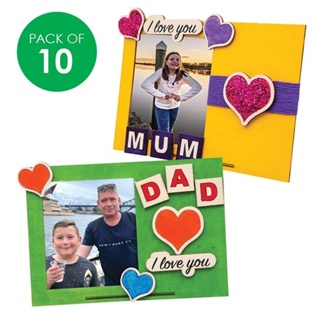 Each frame includes 10 pre-printed pieces for decorating (M, U, M, D, A, D, 'I love you' and 3 hearts in assorted sizes) plus a wooden frame and stand.