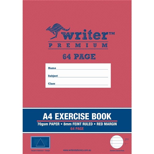 Writer Premium Exercise Books feature heavy duty covers, high quality white 70gsm paper with blue ruled lines and a red margin